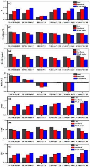 In this study, seven commonly used statistical metrics were applied to evaluate the accuracy of the six products at different temporal scales (daily, monthly, and annual) and different spatial scales (0.25° × 0.25° grid, sub-basin, and whole basin) in comparison to the reference dataset. The relevant metrics are the correlation coefficient (R); the mean absolute error (MAE); the root mean squared error (RMSE); the relative bias (BIAS); the probability of detection (POD); the false alarm ratio (FAR); and the critical success index (CSI). These metrics were calculated as follows: