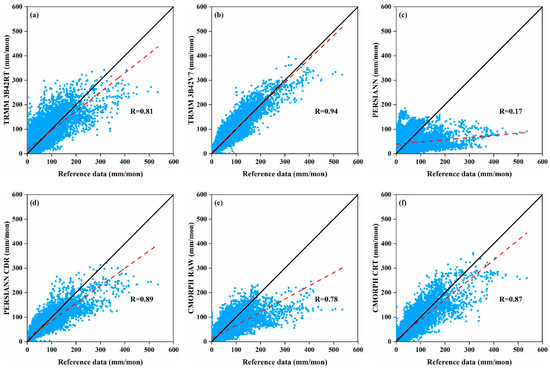 Monthly precipitation scatter plots for the reference data vs. the six SPPs (a) TRMM 3B42RT, (b) TRMM 3B42V7, (c) PERSIANN, (d) PERSIANN CDR, (e) CMORPH RAW and (f) CMORPH CRT at a grid scale.