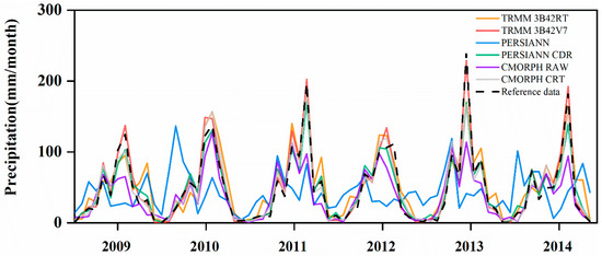Figure 5 shows the temporal variation in the monthly precipitation estimates over the whole basin for the reference data and the six SPPs. TRMM 3B42RT, TRMM 3B42V7, PERSIANN CDR, and CMORPH CRT all performed well, but for TRMM 3B42RT, PERSIANN CDR, and CMORPH CRT, the total summer precipitation was underestimated in 2009, 2013, and 2014. CMORPH RAW roughly captured the monthly precipitation process, but it always seriously underestimated the total summer precipitation. PERSIANN barely managed to track the pattern of the reference data at all.