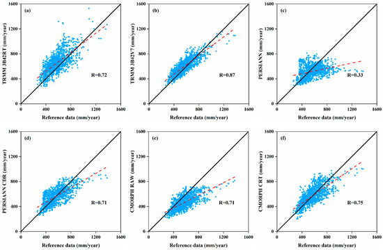 Annual precipitation scatter plots for the reference data vs. the six SPPs (a) TRMM 3B42RT, (b) TRMM 3B42V7, (c) PERSIANN, (d) PERSIANN CDR, (e) CMORPH RAW and (f) CMORPH CRT at a grid scale.