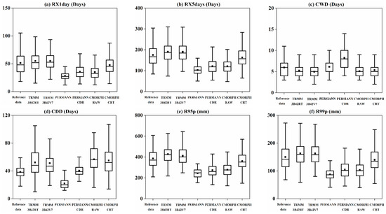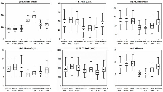 Boxplots for the six absolute threshold indices (a) R0.1mm, (b) R10mm, (c) R12mm, (d) R25mm, (e) PRCPTOP and (f) SDII for the reference data and the six SPPs. The upper and lower edges of the box mark the upper and lower quartiles (75% and 25%, respectively). The solid line in the box marks the median value. The uppermost and lowermost horizontal lines mark the 1.5I QR outliers. The point marks the average value.