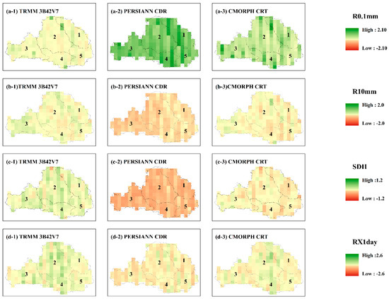 Spatial distribution of mean relative error of the four extreme precipitation indices (a-1, a-2, a-3) R0.1mm, (b-1, b-2, b-3) R10mm, (c-1, c-2, c-3) SDII and (d-1, d-2, d-3) RX1day for the three post real-time products.