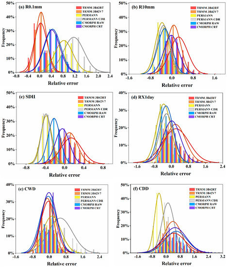In order to illustrate the spatial distribution information for the mean relative error more clearly, frequency distribution histograms and distribution curves for the mean relative error are presented in Figure 10. As can be seen, the distribution curves for TRMM 3B42V7 for R0.1 mm and R10 mm were more peaked and tighter, with mean values closer to zero. This suggests very small extreme precipitation detection differences across the different grids for these two indices. For SDII and RX1day, the average value of distribution curves for TRMM 3B42V7 and CMORPH CRT were near zero. For CWD, the distribution curves for the two types of TRMM product and two types of CMORPH product were similar, while the curve of PERSIANN CDR had a significant deviation to the right, indicating a large number of overestimates. As for CDD, PERSIANN showed a deviation to the left, while the curves for the other products showed different degrees of right deviation. Overall, for most indicators, the ability of TRMM 3B42V7 to detect extreme precipitation was less uncertain than the other products in spatial terms. CMORPH CRT also performed well, but it overestimated the days of precipitation (R0.1 mm) for many of the grids.