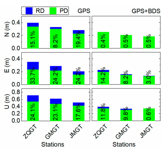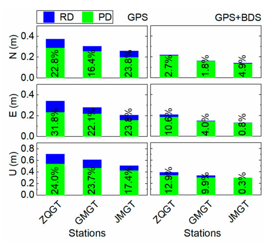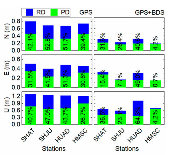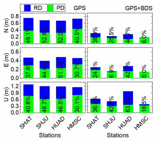 Specifically, in GPS-only solution, the maximum improvement of RMS errors can be found in the N component for station SHJU, with a value of 52.8%, when replacing RD with PD. The corresponding value in GPS + BDS solution is 64.3% in the U component for station HUAD.