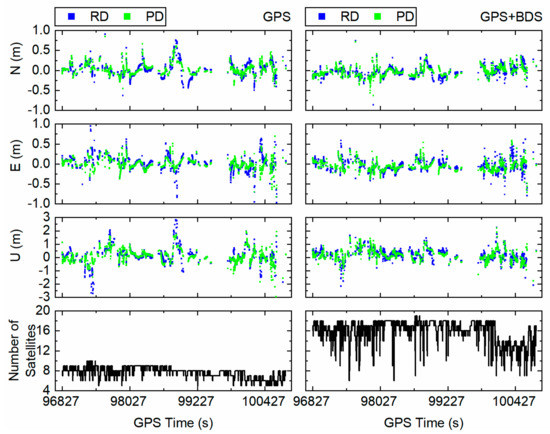 The improvements of GPS + BDS solution with respect to GPS-only solution using PD are about 24%–50%, and the corresponding improvements using RD are about 30%–60%. This, in turn, implies that less accuracy decrease can be found using PD when replacing GPS + BDS solution with GPS-only solution. In particular, the improvements of RMS errors when replacing RD with PD are 13.7%–38.1% in GPS + BDS solution, while the corresponding improvements in GPS-only solution increase. It is also indicated that PD is less affected by the satellite constellation.