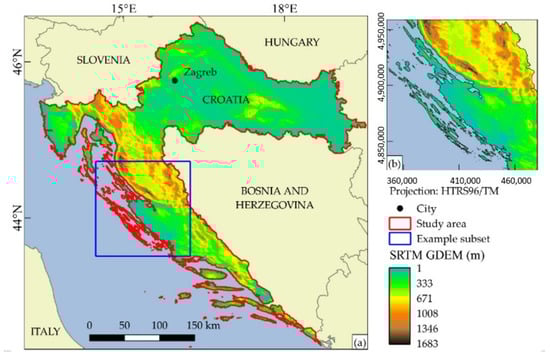 The study area of this research is the land territory of the Republic of Croatia (Figure 1), situated in South-East Europe. The land territory covers 56,594 km2. Due to Croatia’s warm climate and an annual average of more than 2000 sunny hours on the Adriatic coast, it is a good candidate for solar energy exploitation [10].