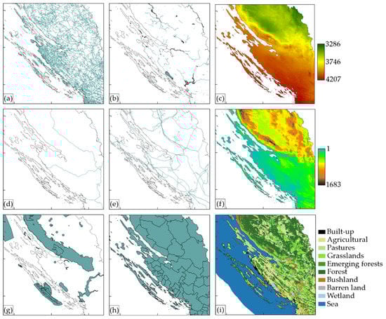 Data used in the research: (a) road infrastructure—OpenStreetMap (OSM); (b) water bodies—OSM; (c) average daily global horizontal irradiation (GHI) (Wh/m2) [10]; (d) railway infrastructure—OSM; (e) electricity network—TTB; (f) Shuttle Radar Topography Mission’s (SRTM) global digital elevation model (GDEM) (m); (g) protected areas—ENVI; (h) administrative units—OSM (i) CORINE Land Cover 2012.