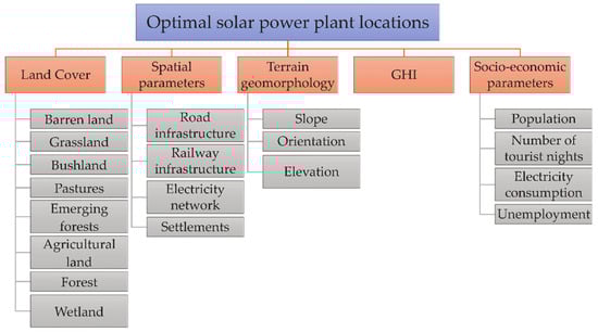 The basic parameter for determining the optimal location for solar power plant construction is the value of the solar potential. For research, the previously developed GHI modeling algorithm was used [10]. In addition to climatic (GHI), other important parameters include spatial, environmental, geomorphological, and socioeconomic data, which are being also used by other authors in relevant research [10,31].
