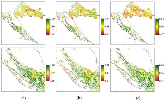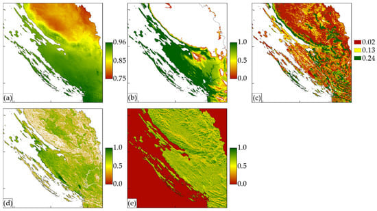 This section describes the results of the research. Since the study area is the entire territory of the Republic of Croatia, and it is not possible to discern the details on the map, an example subset in the Zadar County area was introduced. All analyses (Figure 5 and Figure 6) were performed in the GRASS GIS software (version 7.2.1; Open Source Geospatial Foundation; Chicago; USA) in a spatial resolution of 30 m × 30 m in the official reference coordinate system of the Republic of Croatia HTRS96/TM (EPSG: 3765).