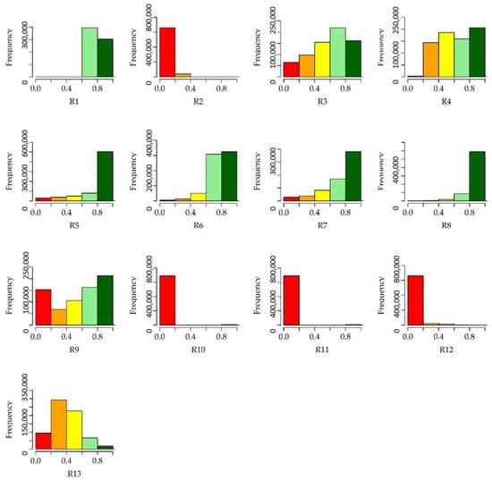In order to analyze the results of the three cases with locations suitable for solar power plants construction, histograms (Figure 9) of three final rasters (F1, F2 and F3) were created, and statistical indicators were calculated (Table 5).