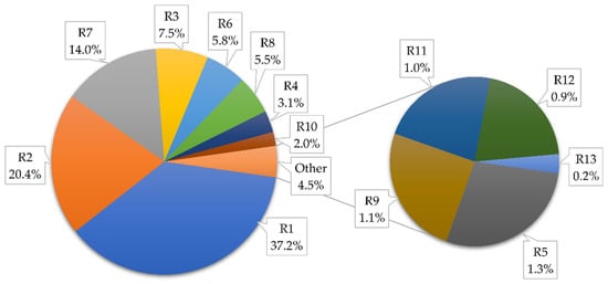 To emphasize the importance of each parameter used in the research, the weight ratio of all parameters for F1 raster is shown in Figure 11. The most decisive parameter in determining the optimal solar plant locations that result from this research are GHI (R1), land cover (R2), and distance to electricity network (R7).