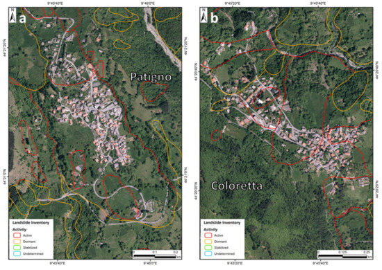 Landslide inventory of the Patigno (a) and Coloretta (b) hamlets.