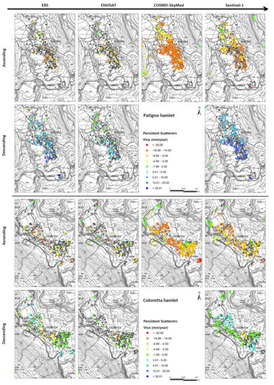 ERS1/2, ENVISAT, COSMO-SkyMed and Sentinel-1 PS data for the Patigno and Coloretta hamlets. Vlos is the velocity measured along the satellite Line of Sight.