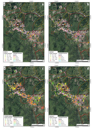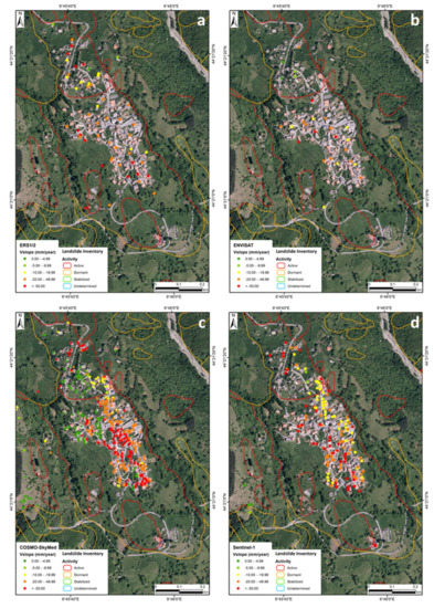 As in the nature of PSI, the urbanized portion of the hamlet are covered by PS, showing a good density of information, while the vegetated areas show no or very few PS products (Figure 3).