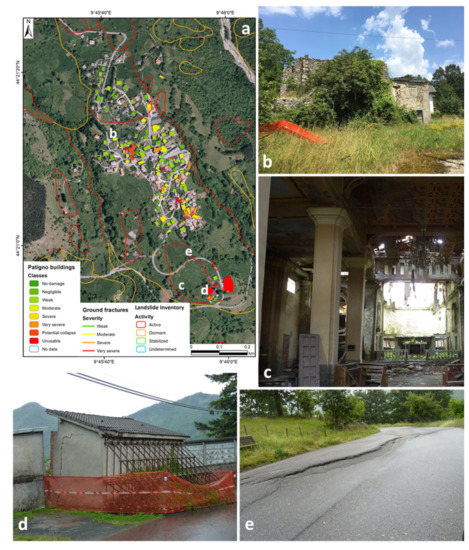 Building damage classification map of Patigno hamlet (a). Different situations can be recognized: a group of buildings abandoned in the center (b); collapsed and highly damaged structures, church and cemetery, at the toe (c,d); important ground fractures recognizable along a linear infrastructure (i.e., a road) (e).