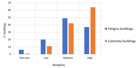 The classification considers two types of load-bearing structures: masonry and reinforced concrete frameworks; steel and timber frames are assimilated to reinforced concrete structures, having similar reactions [77]. Masonry is the prevalent building construction typology in both Patigno and Coloretta; just a few reinforced concrete structures are present.
