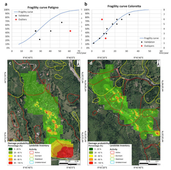 The combination of landslide-induced damage on structure and infrastructure with the ground displacement allows definining the fragility curves of several structures, applying a methodology commonly applied on different engineering fields [50,51,52,53,54,55,56]. These curves represent the probability of exceeding a given damage level in a building or infrastructure as a function of ground displacements.