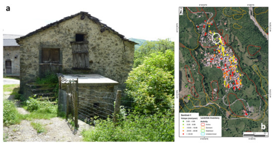 Landslides are considered to be one of the main natural geohazards causing relevant economic damages and indirect social effects worldwide. Italy is one of the European regions most greatly affected by slope instabilities, with more than 500,000 phenomena already mapped (covering approximatively 7.3% of its territory) [1]. Landslides can be triggered by natural (e.g., intense rainfalls) or anthropogenic (e.g., deforestation or poor urban planning) factors [2,3,4,5,6]. In both cases, they can impact structures and infrastructures causing considerable socio-economic damages, direct (e.g., maintenance or reconstruction of damaged structures) and indirect (e.g., difficulties to evaluate, losses of services) [1,7,8,9,10,11,12], as well as fatalities. Spatial and kinematic characterization of landslides, as well as the recognition and classification of landslide-induced damage effects on structures and infrastructures [13,14,15,16], are fundamental elements to better delineate mass-movement boundaries and for improving land managing.