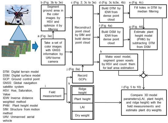 Figure 1 shows a workflow of the construction of the ground surface model and the plant height model in ridge cultivation. First, at different growth stages, the sweet potato field was continuously measured with a camera mounted on a UAV to obtain 2D color images with GNSS coordinates (Figure 1a). Next, in order to construct 3D Digital Surface Models (DSMs) including plants and ground surfaces, 3D point cloud models with color information were constructed from the acquired images using the SfM. Then, the data were converted into 3D dense point cloud models with color information (Figure 1c).