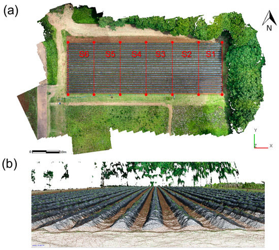 The red lines in Figure 2a indicate the boundaries of each fertilization block. From the right to the left, S1 is the 0 kg/m2 fertilization block followed by 0.025 (S2), 0.02 (S3), 0.1 (S4), 0.15 (S5), and 0.2 kg/m2 (S6). Red colored circles at both ends of the red line are positions of GCPs (iron columns with 30 cm in height and a diameter of 5 cm with yellow marks at the top). The sweet potato field was surrounded by roads, and trees were abundant in the northeast border. In the field, the ridge was covered with black vinyl sheets for multi-cultivation, and ridges were lined up in the east-west direction. The entire image of the field can be seen from the top view image in Figure 2a. Further, characteristics of the ridges and the sweet potato leaves are evident from the side view image in Figure 2b. At this stage, because the plants have limited growth and are not very leafy, it is easy to perceive the separate plants, ground, and black vinyl sheets. Since distant trees could not be measured, some side portions of the trees are missing from the 3D constructed image. Although not shown here, as the plant leaves grew, the ground surfaces were covered by plants, and by 10 August, all parts of the field were covered with plants. The dark dead leaves increased around 5 September, and the yellow dead leaves became noticeable around 15 October.