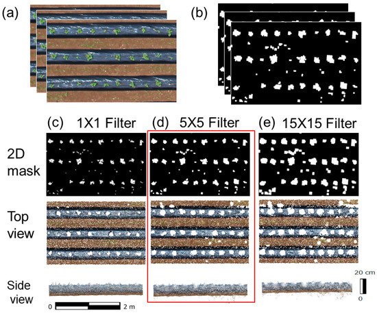Examples of plant area removal and enlargement filtering. (a) 2D images; (b) Images after plant removal process; (c) 1 × 1 enlargement filtered data; (d) 5 × 5 enlargement filtered data; (e) 15 × 15 enlargement filtered data.