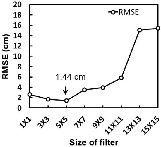 Figure 4 shows an error comparison between the actual value and the estimated value of the ridge heights obtained from the DTM, which was processed with different sizes of enlargement filters. Note, that in the DTM constructed, the hole caused by the removal of the vegetated area remains. Therefore, an error evaluation of the estimated and actual value of places other than holes was performed. When using the 5 × 5 filter, the error of the ridge height was minimized, and the Root Mean Square Error (RMSE) was 1.44 cm. Filter sizes of less than 5 × 5 did not work well to remove the shadow area around the plants. In the case of filter sizes larger than 5 × 5, the error became large due to the loss of the ground surface accompanying the expansion of the hole.