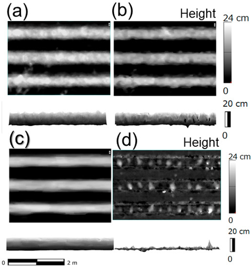 Figure 5b shows an example of DTM after 5 × 5 enlargement filter processing, which is shown in Figure 3D. The entire process is shown in Figure 1d. Note that top view images are shown in the upper part, and side view images are shown in the lower part. In Figure 5b, while plants and shadows are completely removed, large holes can be seen in DTMs because of the removal of the plant area and the enlargement filtering process. Figure 5c shows the result of median filtering to fill the holes. Although, median filtering was performed with N = 7 and M = 1, the unevenness of the ground surface could be reduced while leaving the shape of the ridges. Figure 5d is a plant height model (PHM) obtained by subtracting the DTM (Figure 5c) from the DSM (Figure 5a).