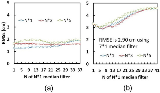 Figure 6 shows the errors between the estimated values and the actual measurements of ridge heights (DTM) and plant heights (PHM) due to the difference in size of the N × M median filters applied to the DTM. In these cases, where there is an error in the ride heights (A), the smaller the filter size, the smaller the error. This is because the error evaluation was made without the hole portions. The RMSE was 1.44 cm with a filter size of N = 1 and M = 1. On the other hand, the error of the plant height was the smallest with a filter size of N = 7 and M = 1, with an RMSE of 2.90 cm. This is because the filter size N in the direction of the ridges needs to be a size that would fill the hole, but if it is too large, the shape of the ridges will differ from the actual shapes. For the filter size M, a smaller filter size worked better. Filter size M is defined for the cross-sectional direction of the ridge. The cross-sectional direction of the ridges should have the smallest size, which does not affect the shape rather than the filling effect.