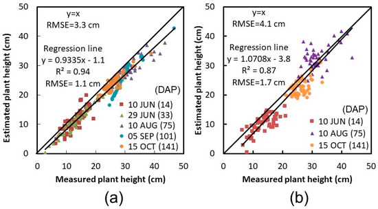 In the previous section, errors between the actual measurements and the estimated values from the plant height model (PHM) derived from 10 June data was described. In this section, the error evaluations of PHMs were performed over the entire growth period (10 June, 29 June, 10 August, 5 September, and 15 September) from the planting of seedlings to the harvest time. PHMs were generated by subtracting the DTM of 10 June from the DSMs of each growing period. Figure 7 shows the measured values versus the estimated values. Figure 7a shows a comparison of the actual measured values versus the PHM constructed values from an image set measured with a 28 mm focal length lens, and Figure 7b shows the result obtained using a 50 mm focal length lens. Approximately 300 points were compared for the 28 mm lens generated data, and about 180 points were compared for the 50 mm lens generated data. In the figures, the horizontal axis (x) shows the actual measurement values, and the vertical axis (y) shows the estimated values from the PHM.