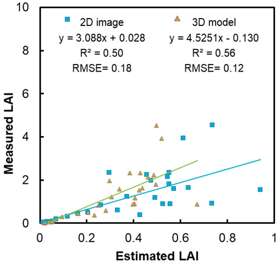 There are only a few studies that focus on the accuracy assessment of leaf area and biomass estimation using 3D dense point cloud models derived by UAV-SfM. Mathews & Jensen [23] conducted research on the LAI estimation of a vineyard. They used a vineyard with an observed LAI between 0.5 to 5.5. Point extractions were made using rectangles sized 1 m × 2 m, centered on sample vine trunk locations. Then, point cloud heights between 0.3 m and 2.3 m were used for the calculation. Subsequently, the regression line was based on the actual values, and the estimated values of the leaf area were calculated. The results showed that the estimation of errors for LAI were an R2 of 0.57 and an RMSE of 0.236.