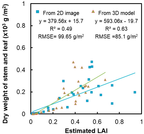 Figure 9 shows the relationship between the LAI estimated from the 3D voxel model and the above-ground dry matter weight (stem and leaf). The relationship between the LAI estimated from the 2D image and the above-ground dry matter is also shown in Figure 9. The relationship between the LAI (x) and dry matter weight (y) obtained from the 3D voxel model was y = 0.0593x − 19.7 (R2 = 0.63, RMSE = 86.1 g/m2). Similarly, y = 0.0380x + 15.7 (R2 = 0.49, RMSE = 99.6 g/m2) was obtained using the 2D image data. The 3D voxel model showed a better coefficient of determination and a smaller error.