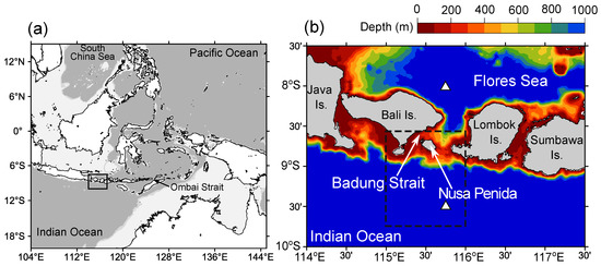 (a) Overview of the Indonesian archipelago and Indonesian Sea. The area around the Lombok Strait, indicated by black rectangles, is enlarged in (b). In (b), the color contour indicates the water depth. Depths deeper than 1000 m are indicated by the same color (blue). The black dashed line indicates the area focused on this study. The two white triangles indicate the representative positions of the Flores Sea and Indian Ocean to show the difference between the sea surface temperatures (SSTs) at these two positions in Figure 2.