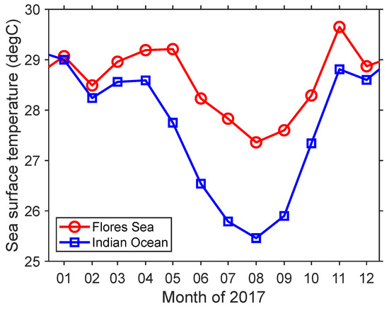 Monthly SST in the Flores Sea and Indian Ocean in 2017. The representative position of the Flores Sea is 115.45 E and 8 S, and that of the Indian Ocean is 115.45 E and 9.5 S (shown as the white triangles in Figure 1b).