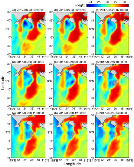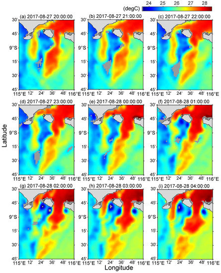 Hourly SST fields in the area south of the Lombok Strait from (a) 20:00 on 27 August 2017 to (i) 4:00 on 28 August 2018. The gray pixels indicate no SST data for those pixels because of cloud or land.