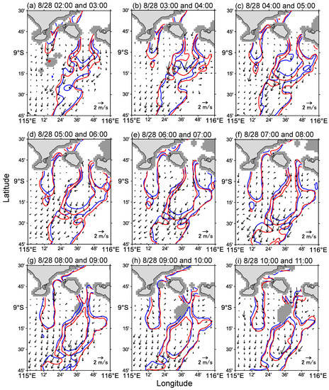 Surface current velocity fields estimated by applying the MCC method to the sequential SST images of Figure 3 and Figure 4. The results shown are obtained from the SST images from 2:00 to 11:00 on 28 August 2017. In each panel, the blue and red lines are isotherms of 26 C and 27 C of the first and next SST images, respectively.