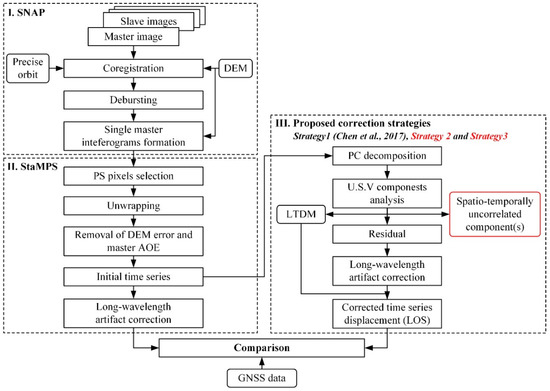 The data processing methodology is illustrated in Figure 2. Up to the step of the single master interferogram formation, the processing was conducted using SNAP software [42] provided by the European Space Agency. The main steps of the PSI algorithm were implemented using the StaMPS package [36]. The traditional long-wavelength artifact correction method provided by StaMPS and the artifact correction method grounded on the theory of PC analysis (PCA), recently proposed by Chen et al. [6] (Strategy 1), were both found inadequate for high-precision displacement monitoring in this study (see following subsections). The main reason is that they do not account for the spatiotemporally uncorrelated components contained in the InSAR signal. Therefore, new correction strategies (Strategy 2 and Strategy 3) by further enhancing the method addressed in Chen et al. [6] were proposed in this study. These two strategies analyze, in detail, each PC derived from the PC decomposition. The methodology is detailed in the following.