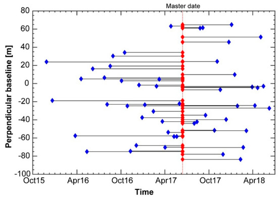 Perpendicular and temporal baselines of interferograms. Red diamonds indicate the master image, blue diamonds represent slave images and black lines represent interferograms formed from the master image and corresponding slave images.