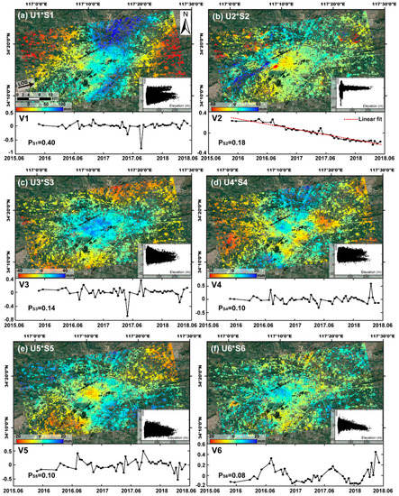 Results from the principal component (PC) decomposition applied to the initial InSAR time series, including the spatial function weighted by significance value (U*S), temporal function (V) and proportion of significance value (Ps) for each PC (sub-figures (a)–(f) for PC1–PC6). The scatter plots indicate the correlations between the PCs and the elevation (see Section 2 in the Supplementary Materials for enlarged scatter plots). Maps are overlain draped on a Google Earth image and projected in geographic Lat/Lon referenced to the WGS-84 datum.