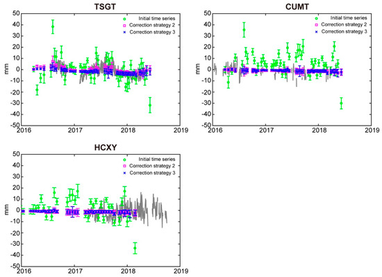 Line-of-sight displacement comparison between GNSS and InSAR time series derived from different strategies at stations TSGT, CUMT and HCXY (see Figure 1 for locations). Gray lines in the background indicate GNSS measurements. Green circles, magenta squares and blue crosses indicate the measurements of the initial InSAR time series and the InSAR time series corrected by Strategies 2 and 3, respectively. Error bars represent standard deviations within 20 m neighboring areas.