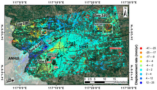 Displacement rate map derived from InSAR time series corrected by Strategy 2, for the entire study area during November 2015 to June 2018. Positive values represent decreases in earth–satellite distance, while negative values represent increases in earth–satellite distance. The subway lines are marked by black lines. Zone 1, Zone 2 WG (the western goaf), Zone 3 EG (the eastern goaf) and Zone 4 J-MG (Jiuli-Ma village goaf) outlined by dashed black lines are the main displacement areas in addition to the subway line buffers. Location of Shitun, Jiahe, Pangzhuang, and Zhangxiaoloujing old coal mines in Zone 2 and of Qishan and Quantai old coal mines in Zone 3 are indicated by black circles. The two white rectangles represent areas which are enlarged and analyzed in detail in Section 5.2. Filled red triangles indicate the locations of the GNSS stations used in this study. Red rectangles indicate zones where no displacement is expected to occur (corresponding to “non-displacement zones” mentioned in the text). The filled red star indicates the location of the reference area. The map conventions are the same as in Figure 4.