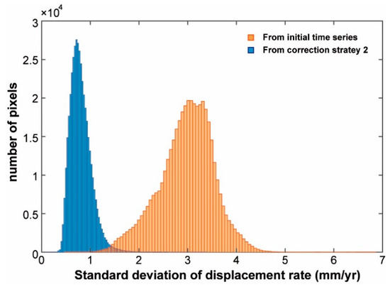 Histograms of standard deviations of displacement rates derived from the initial time series and corrected time series obtained from Strategy 2.