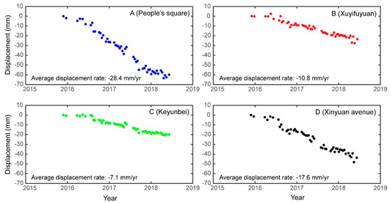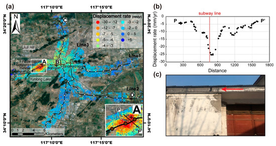 Construction of the three subway lines (Lines 1–3) in Xuzhou commenced in December 2015, February 2016 and August 2016, respectively, and remained ongoing at the end of our study period. Although the SAR images are incapable of acquiring information regarding the inner structures and tunnels of the subway lines, it is possible to capture the overlying surface subsidence along the paths of the subway tunnels using InSAR [12,51,52]. The displacement rates within the 1 km buffer zone of the subway lines between November 2015 and June 2018, as derived by PSI analysis, are shown in Figure 8. They indicate a spatially heterogeneous trend of subsidence development concentrated in the main urban area, mainly between Xingshanzi station and the Xuzhou railway station along subway Line 1, and from the Pengcheng Square station to Keyunbei station along Line 2. Except when traversing the main urban area, most stations of subway Line 3 were stable during the study period. This uneven behavior of displacement could be attributable to the fact that the main urban area possesses the majority of dense high-rise buildings, and that the construction of the subway lines most probably adds further pressure to the already fragile overlying strata, resulting in land surface displacement. The area of most significant displacement (approximately −10 to −30 mm/yr) was observed around the People’s Square, Gongnong Road and Hanshan stations that are on the western limb of Line 1. The inset in Figure 8a shows an enlargement of the displacement rate of the area outlined by the white rectangle. To obtain a clearer idea of the displacement pattern, we constructed a profile line (P-P’) shown in Figure 8b. The profile shows that the pattern of subsidence in the transverse direction to the subway line is >1 km wide and that the transverse subsidence approximates a Gaussian distribution. The magnitude of subsidence decreases gradually with distance from the center of the subway tunnel, indicating that the pattern of subsidence is strongly associated with subway construction. Fieldwork results revealed that the pattern of subsidence has had marked effects on surrounding buildings (Figure 8c). The peak average subsidence rate of this pattern (−28.4 mm/yr) was found at point A near the People’s Square station (Figure 8a). The displacement time series for points A–D located near Xuyifuyuan station in the urban area, Keyunbei station on the northern limb of Line 2, and Xinyuan Avenue station in the new urban area are illustrated in Figure 9. It can be seen that the temporal evolutions of subsidence at points A−D can be described approximately by linear trends with average subsidence rates of −28.4, −10.8, −7.1 and −17.6 mm/yr, respectively. However, two different stages of subsidence can be recognized at points B−D: (1) The ground surface was most likely stable until around mid-2016, and (2) rapid subsidence has occurred since then. At the end of the study period, the subsidence rates at the four points showed no sign of decreasing, indicating that subsidence will likely continue over the following years. The displacement time series at the four points appear to coincide with the time of subway construction work, suggesting the subsidence at these points is related to the construction work.