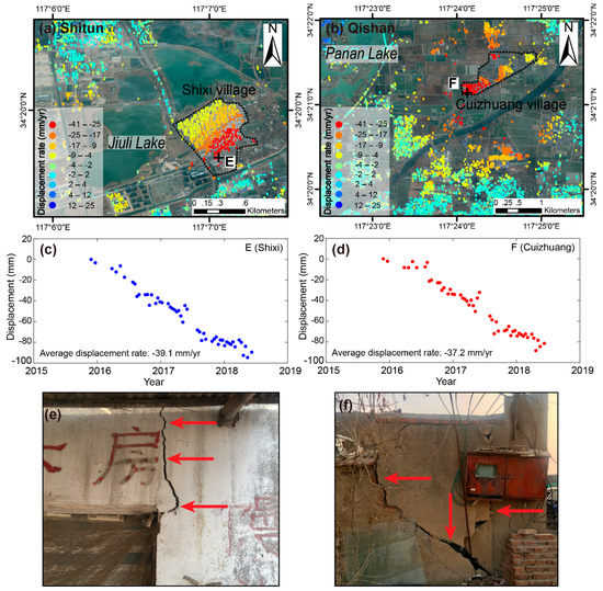 Xuzhou has a coal mining history extending over 130 years that has resulted in many areas of large subsidence. By 2014, the area of subsidence in the Xuzhou urban planning area related to coal mining activities was approximately 180 km2 [49]. Most coal mines in the Xuzhou area have closed successively in recent years following the structural de-capacity policy of the Chinese coal industry (e.g., Quantai mine closed in 2010; Jiahe, Pangzhuang and Zhangxiaoloujing mines closed in 2015; Qishan mine closed in 2016; Shitun mine closed in 2017; see Figure 6 for locations). However, because of the overburden of strata, persistent subsidence of between approximately −5 and −40 mm/yr remains evident in the few years following closure. As one of the first mines to close, the area around the Quantai mine still experienced land surface subsidence in the range of −5.2 to −15.5 mm/yr during the five to eight years after closure. Approximately 85% of this area is still affected by subsidence rates of under −10 mm/yr, suggesting that the goaf of the Quantai mine might tend towards stability in the near future. The most significant subsidence rates of up to −19.0, −24.3 and −32.0 mm/yr were found for Jiahe, Pangzhuang and Zhangxiaoloujing mines, respectively. Enlarged maps of the displacement rates in the Shitun (WG) and Qishan (EG) mining areas (outlined using white rectangles in Figure 6) are illustrated in Figure 10a,b, respectively. The villages of Shixi and Cuizhuang were officially designated hidden danger sites (at extra high and high levels, respectively) of geological disaster attributed to ground subsidence, according to the Geological Disaster Verification Report of Xuzhou [49]. Similarly, they are also within the areas found most affected by land subsidence related to the Shitun and Qishan mines in our study (Figure 10a,b). The subsidence rate in Shixi increases from northwest (−8.1 mm/yr) to southeast (−40.5 mm/yr), while that in Cuizhuang increases from northeast (−13.4 mm/yr) to southwest (−37.5 mm/r). The time series for points E and F in Figure 10a,b are shown in Figure 10c,d. It can be seen that the subsidence in both Shixi and Cuizhuang follow a linear trend of temporal evolution. Severe fissures have been caused in local houses by land subsidence (see examples in Figure 10e,f). More than 1500 people in the area are threatened by the land subsidence hazard and the potential cost of the damage is 30 million RMB [49], which highlights the importance of monitoring displacement in goaf areas.