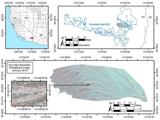 Deserts cover nearly one third of the Earth’s land surface [1,2]. The biome supports surprisingly high biodiversity despite stressful environmental conditions. Desert environments are sensitive to environmental shifts, and reversing environmental impacts can take decades or even centuries [3]. Many desert lands in the world undergo significant changes caused by various forces, including climate change [4], exotic species invasion [5], over grazing [6], excessive recreational use [7], and extensive development [8]. In the United States, the desert southwest region has been experiencing considerable pressure from energy development, such as pipelines, transmission lines, wind farms, and solar energy facilities. Solar energy development in the United States arid desert areas has been a particular focus over the past decade, and guidance has been developed to mitigate impacts from solar development on public lands [9]. Despite the benefits of solar energy for decreasing greenhouse gas emissions in comparison with fossil-fuel based energy sources [8], some impacts of large-scale solar energy development on desert environments are of concern because of the large development footprint and potential to impact microclimates and land cover [10,11]. Degradation of desert ecosystems is a serious concern in other parts of the world. For example, exotic species invasion has led to significant reduction or extinction of native plant species in the Middle Eastern deserts [5]. Plant diversity and productivity have severely declined due to sheep grazing in the desert steppe of northern China [6]. To combat the widespread degradation of desert lands, developing the ability to detect early signs of habitat disturbance and to monitor changes efficiently over time is critical to ensuring mitigation of the initial impact and prevention of further degradation [12].