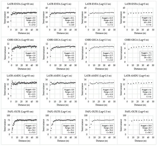 Semivariograms of the LATR–ENFA, CHRI–GECA, LATR–AMDU, and PAFL–OLTE alliances with selected lags—50 cm, 1 m, 2.5 m, and 5 m. na = not applicable.