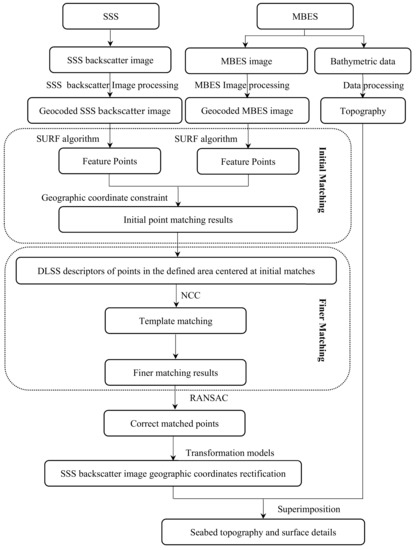 Secondly, the SSS and MBES image matching based on common features is conducted, which includes the initial matching with the SURF algorithm with image geographic coordinate constraint and finer matching by using dense local self-similarity (DLSS) descriptors.