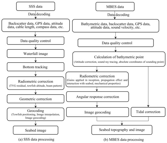 The flow charts of SSS (a) and MBES (b) data processing.