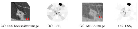An example of local self-similarity (LSS) descriptor. The (a) and (c) are SSS and MBES image; red rectangles in (a) and (c) are the locations of the feature points; (b) and (d) are LSS descriptors of the two points.