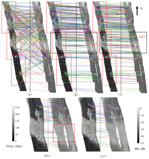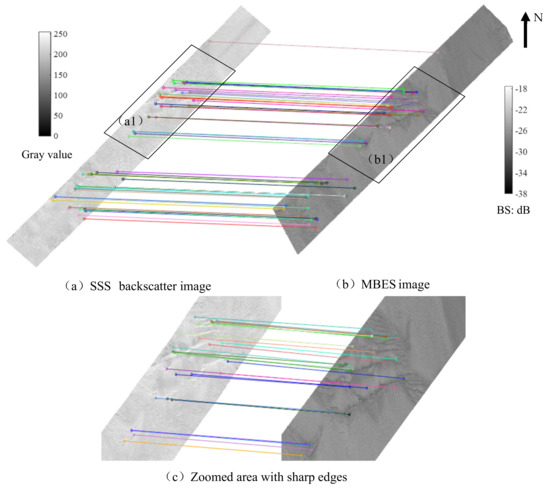 Moreover, since there are many more sampling points for SSS measurement than for MBES measurement, the seabed features in the MBES image may not be as clear as those in the SSS backscatter image. As a result, some feature points may be detected in the SSS backscatter image but cannot be presented in the MBES image. Consequently, it was found that several detected feature points in the SSS backscatter image are matched to one feature point in the MBES image, particularly in zoomed area (b1) of Figure 6b. This several-to-one matching problem is obviously incorrect, which will be settled in the finer image matching step.