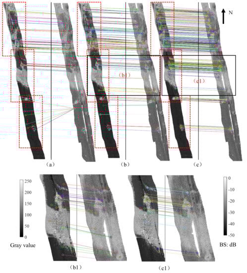 Even if the finer image matching step is followed, there still exist mismatches in Figure 6c. To eliminate theses mismatches, the SSS backscatter image was segmented into blocks and the RANSAC algorithm was adopted in each block. In the segment process, it can be seen that there exist three main independent areas with abundant seabed features. Thus, the SSS backscatter image was segmented into three blocks according to the feature distributions and towfish attitudes. Meanwhile, the overlapping ratio of one seventh between adjacent blocks was set and the split lines lay on the edge of isolated targets, which can be seen in the red rectangles in Figure 6 and Figure 7. The image matching results after this process are shown in Figure 7 and Table 1. It can be seen that even after using the RANSAC algorithm, some mismatches still exist in Figure 7a, because too many mismatches occurred due to the use of the SURF algorithm directly and the RANSAC algorithm is sensitive to the high outlier rate. As a result, these mismatches cannot be effectively eliminated by using the RANSAC algorithm. This phenomenon also proves that adding the constraint of image geographic coordinates in the initial matching step was necessary, which improved the matching ratio from 8% to 55% as shown in Table 1. Even so, mismatches still exist after the initial step, which can be seen in the zoomed area (b1) of Figure 7b. After the finer image matching step, the matching ratio rose to 86%. More importantly, these matches are correct, as shown in the zoomed area (c1) of Figure 7c. This is because the combination of both the initial and finer image matching not only makes full use of the intensity variations and gradient information of feature points, but also considers their geographic coordinates and the shape properties of the area around them.